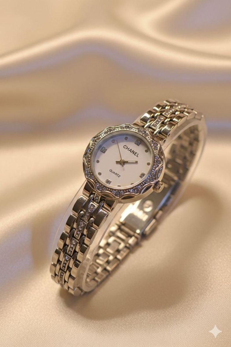 ساعه موديل ماركه شانيل ذهبي وفضي استرس
